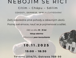 Více informacíWorkshop NEBOJÍM SE ŘÍCT je druhou aktivitou projektu Rodina je tým a je zaměřen na prevenci sebepoškozování, úzkostí a depresivních stavů u dětí ve věku 10–15 let. Společně hledáme cesty, jak o emocích mluvit dřív, než začnou bolet.